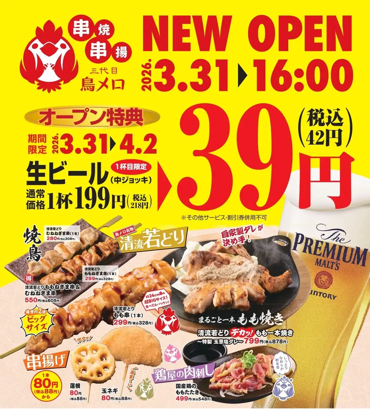 【感謝の39ビールキャンペーン】2026年3月31日(火)三代目鳥メロが新規オープン